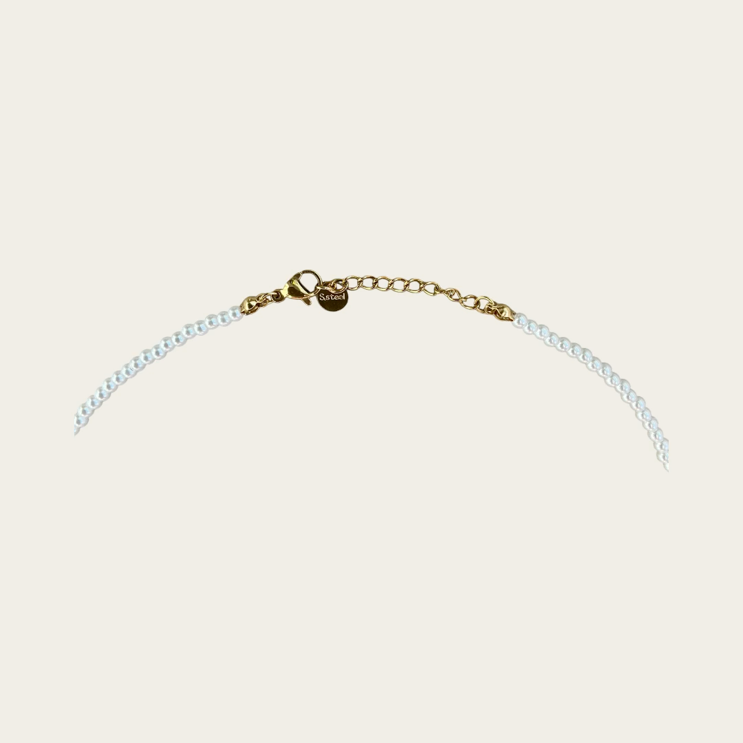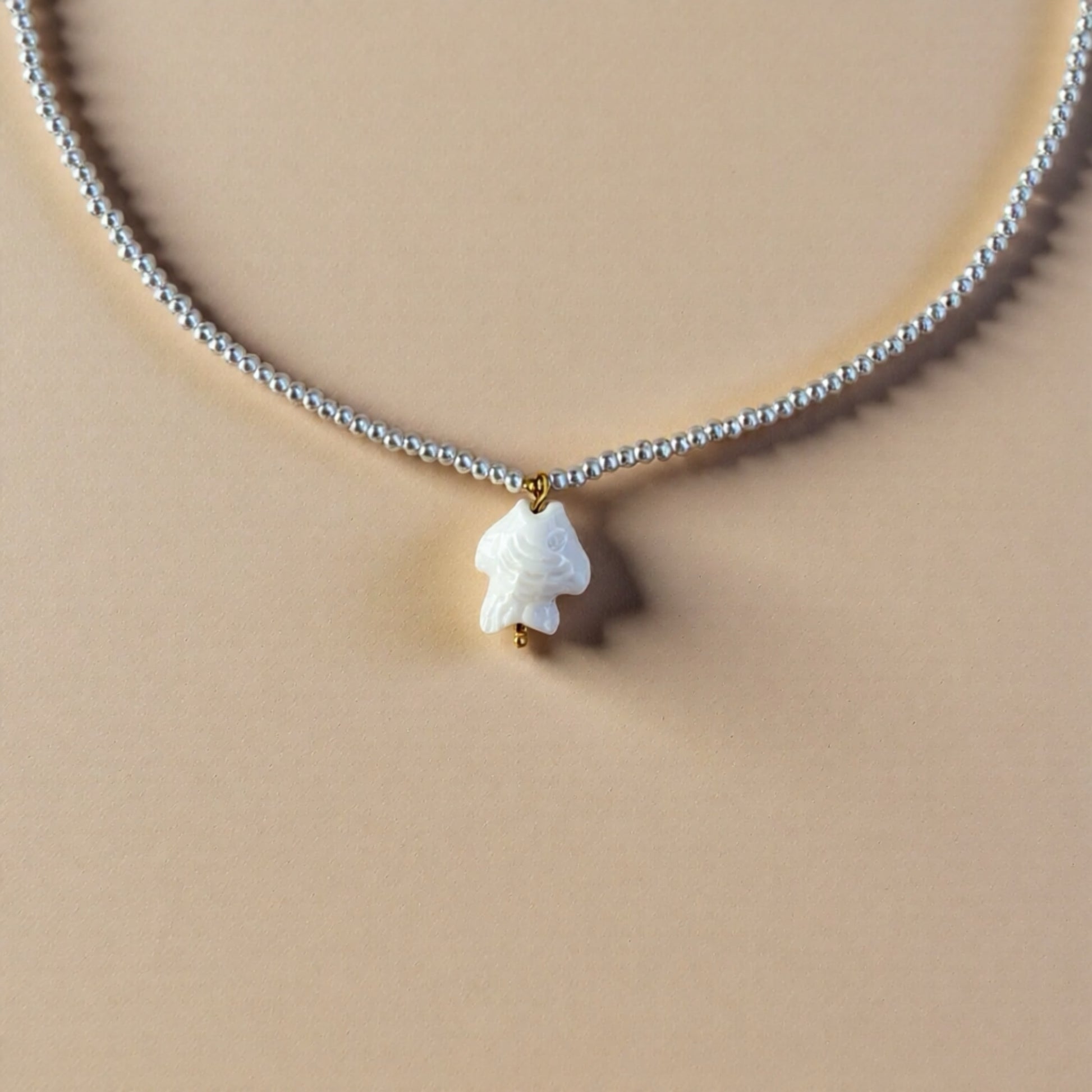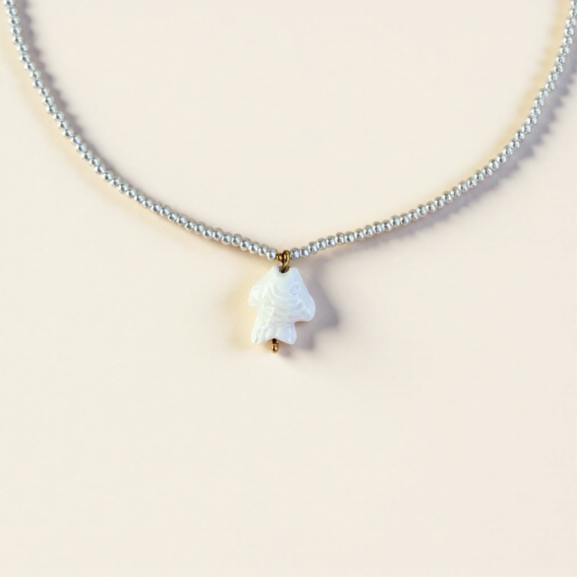 Elegant and refined, the Marina Necklace captures the beauty of the ocean through the purity of the pearls and the delicacy of a small fish pendant, a symbol of freedom and marine harmony. Each pearl softly reflects the light, while the pendant adds an original and poetic touch. A timeless piece of jewelry that adorns your outfits with a natural radiance.